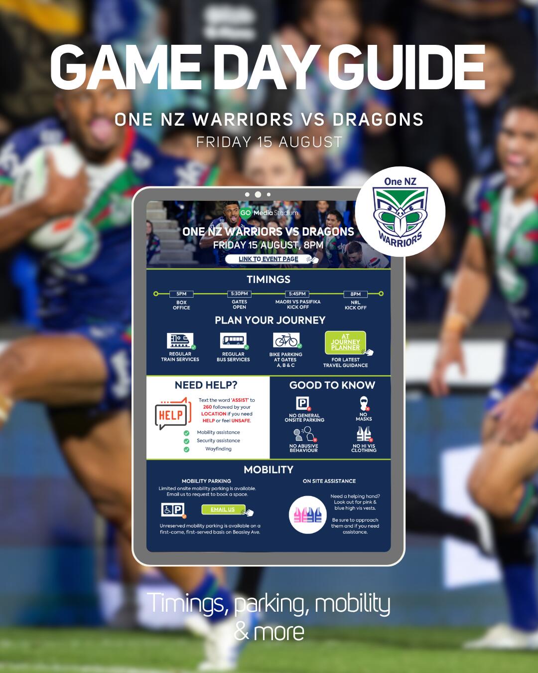 Go Media Stadium is a mobility friendly venue. To book a mobility ticket or enquire around accessibility seating please call the Ticketmaster Contact Centre on 09 970 9711 or visit http://www.ticketmaster.co.nz/help.